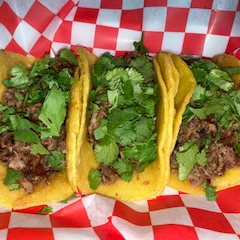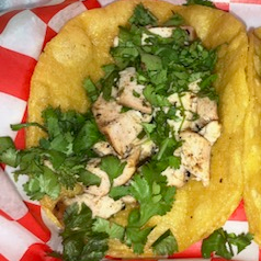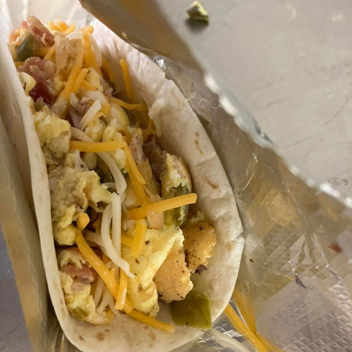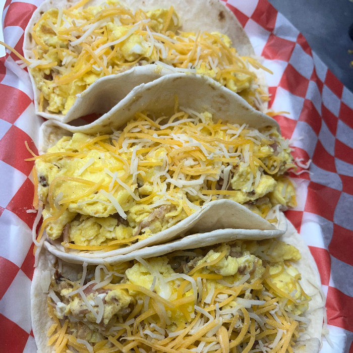 Single breakfast tacos. 2 eggs, meat, and cheese on a 6" flour tortilla.