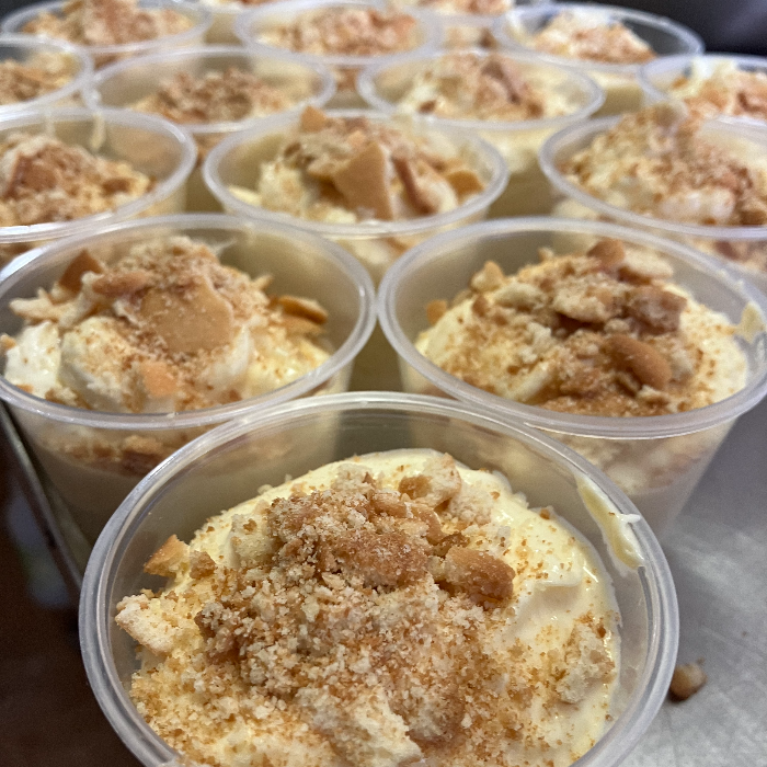 Layers of brisket, bbq baked beans, corn, mashed potatoes, topped with bbq sauce and cheese.