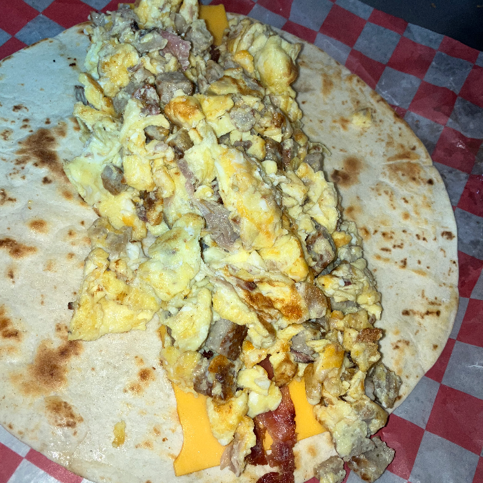 Comes with 3 eggs, 3 meats (brisket, bacon and breakfast sausage) and 3 cheeses! Served on a 9" tortilla.